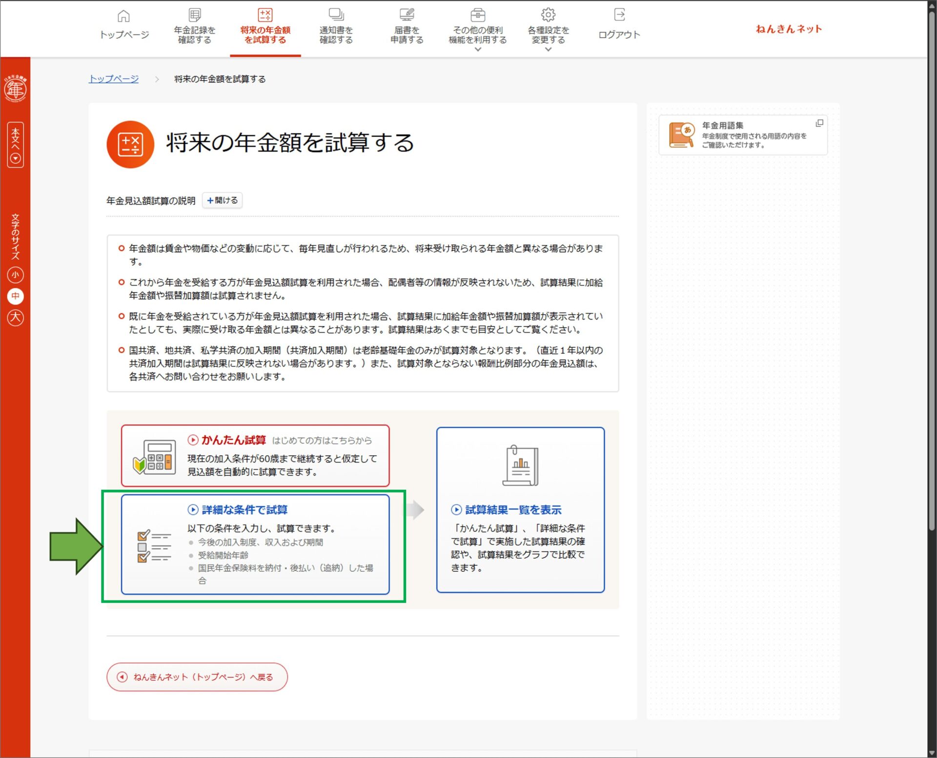 - 「詳細な条件で試算」を選択