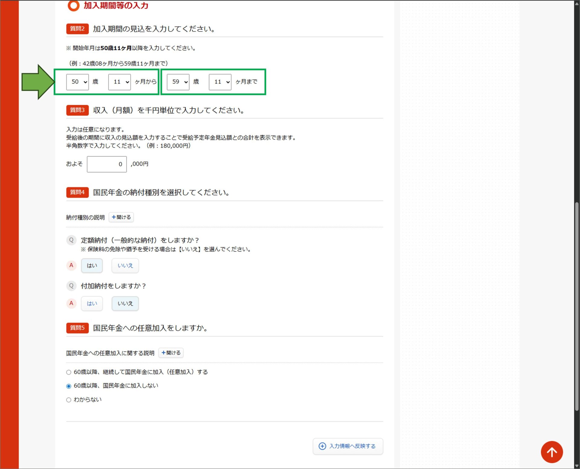- 加入期間等を入力し、「入力情報へ反映する」ボタンを押下