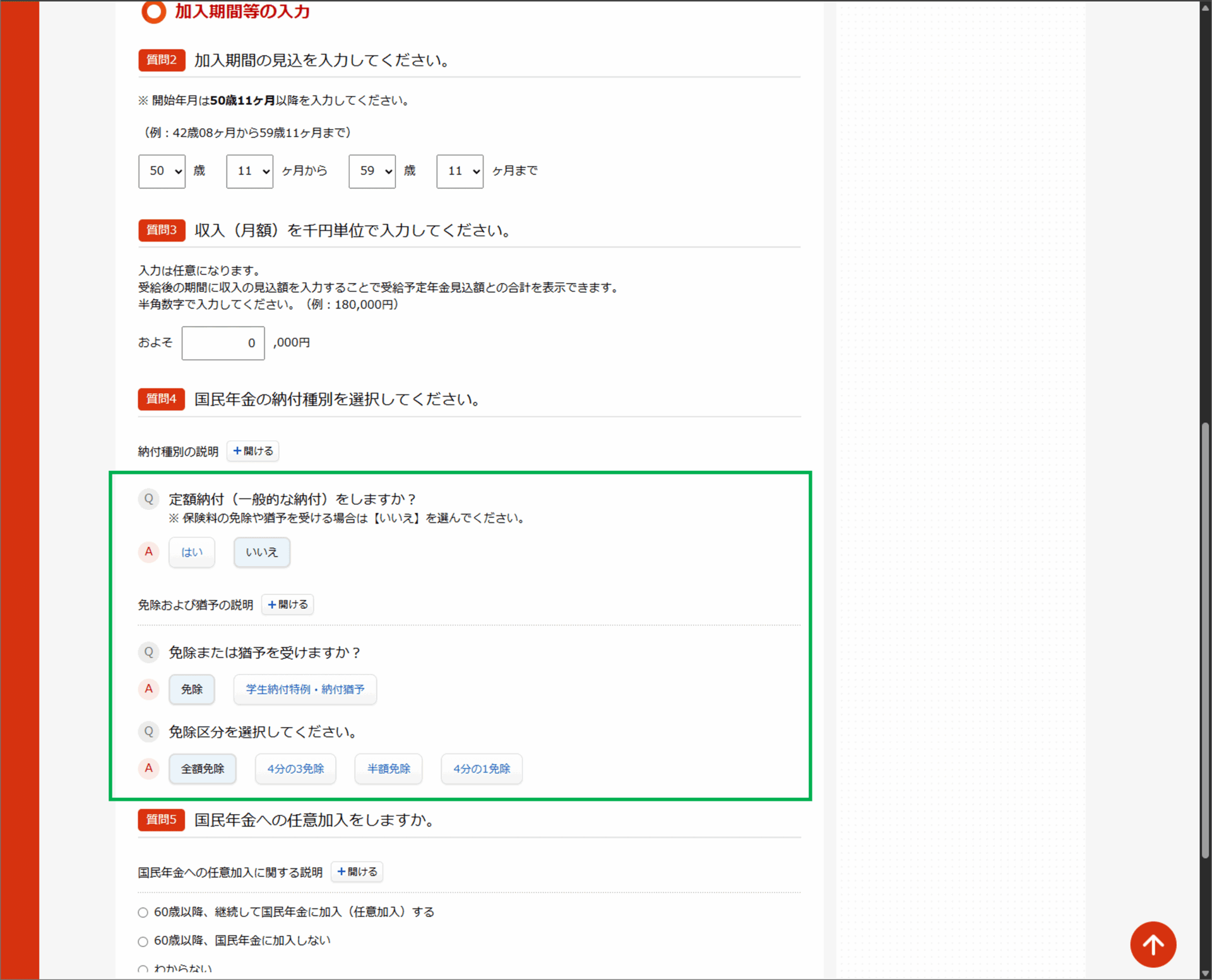 なお、フルリタイアにより収入がなくなるため、国民年金保険料の免除を受ける場合は、「加入期間等の入力」欄で下記のように選択してください。